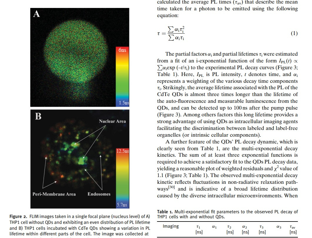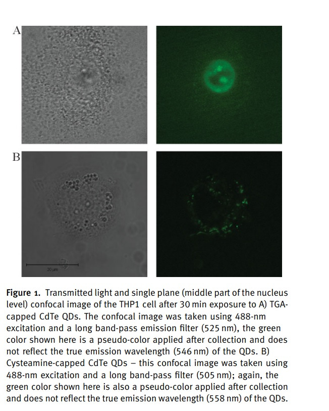 Figure 1A illustrates the accumulation of 3.2-nm-sized thioglycolic acid (TGA)-capped QDs in the nucleus and nucleoli of THP1 cells after 30 minutes of incubation.