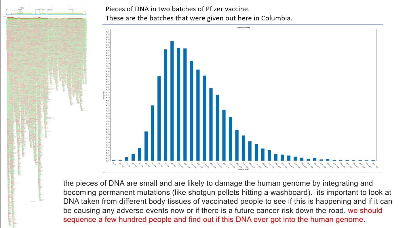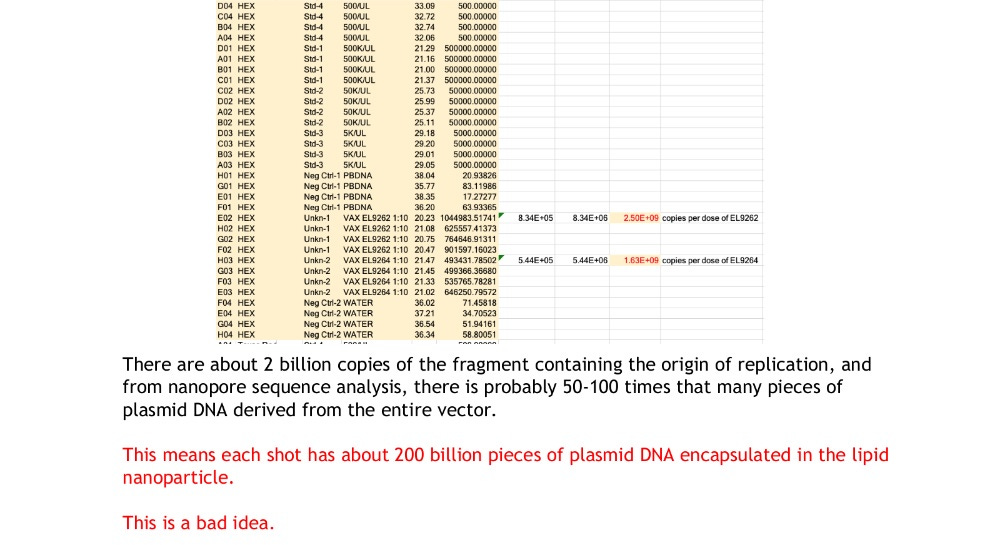 If we do simple math, based on Dr. Buckhaults and Kevin McKernan’s findings, there should be about 4000 on average pieces of DNA plasmid in each LNP now, if they were evenly distributed, with an average base pair size of anywhere between 100 to 120, although, sizes were found much higher and lower.