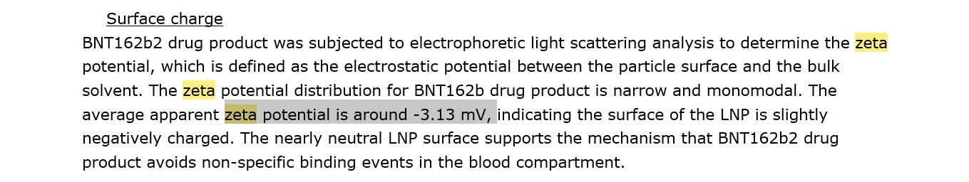 Pfizer stated the starting zeta potential in their own documents (thanks Mckernan) was approximately -3 millivolt when it was tested using process one, which did not contain any DNA plasmid. The thing is, zeta potential changes in pH, when viscosity changes, ions present in blood, etc, and even without DNA plasmids present as contamination, the zeta potential would shift right away when entering the human body to about -8 millivolt.