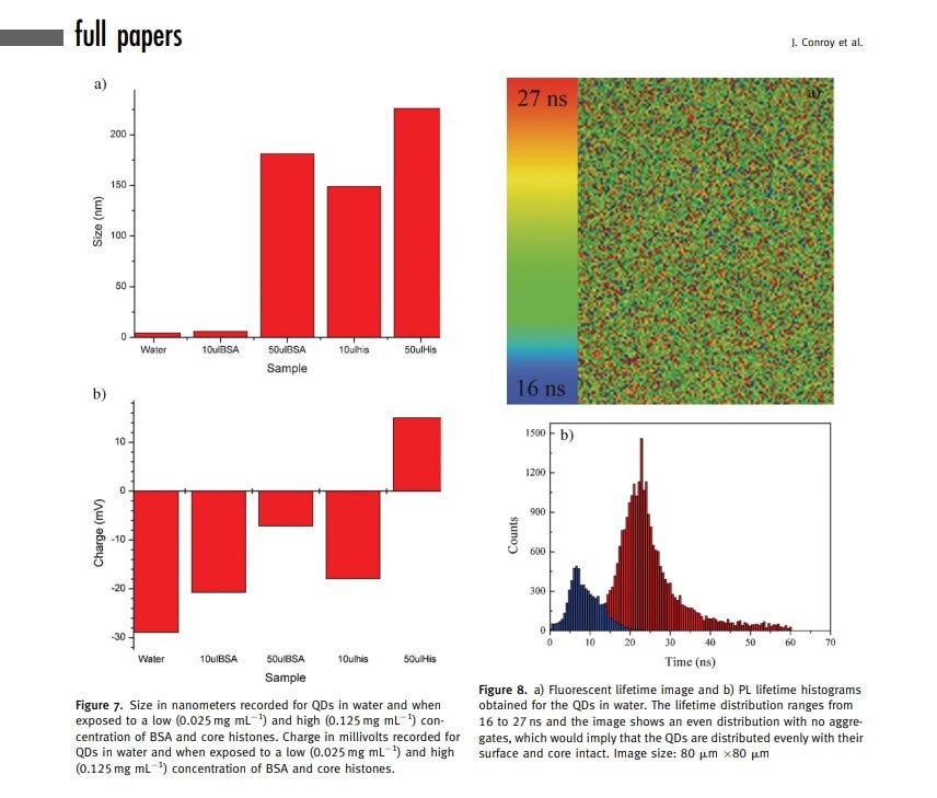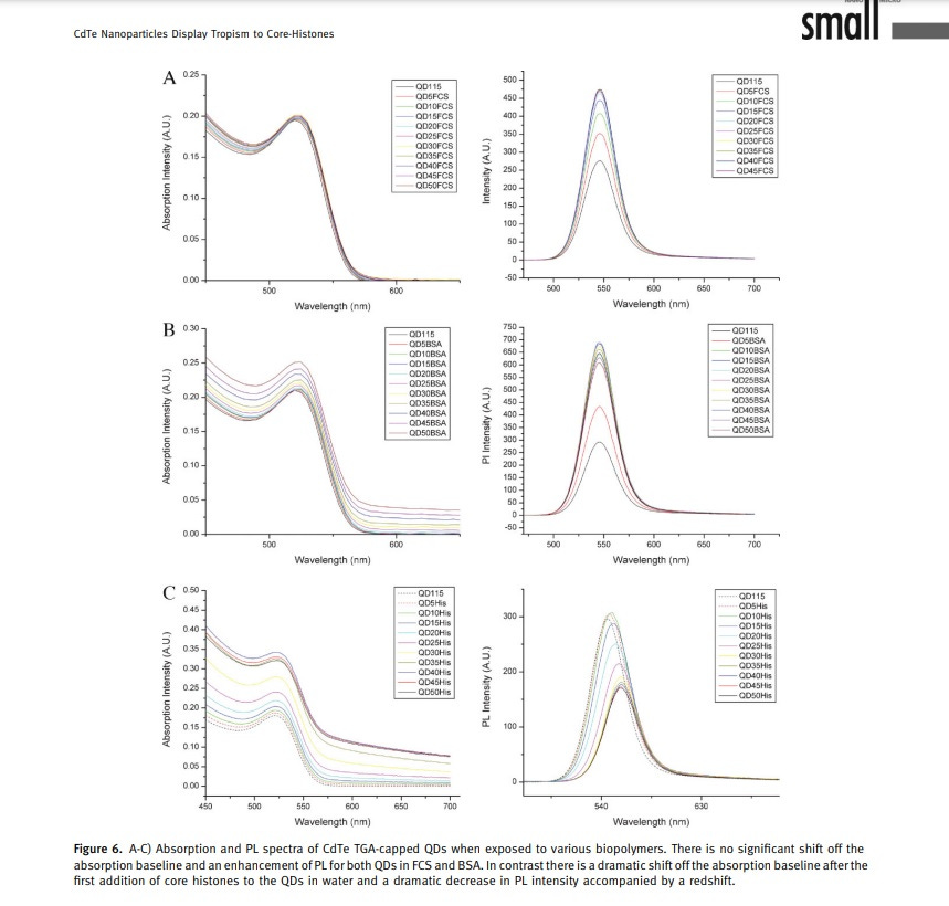From an imaging standpoint, the interaction with core histones leads to a dramatic shift in the absorption band, a redshift, and a decrease in the photoluminescence (PL) intensity of the QDs.